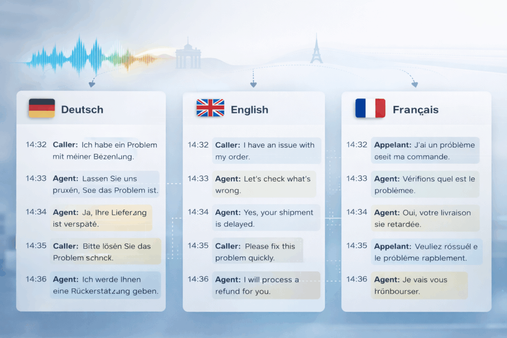 - Internationale Teams, die das Telefongespräch in Textform umwandeln möchten d.h. die Transkripte (das Telefongespräch in Textform) in mehreren Sprachen benötigen.